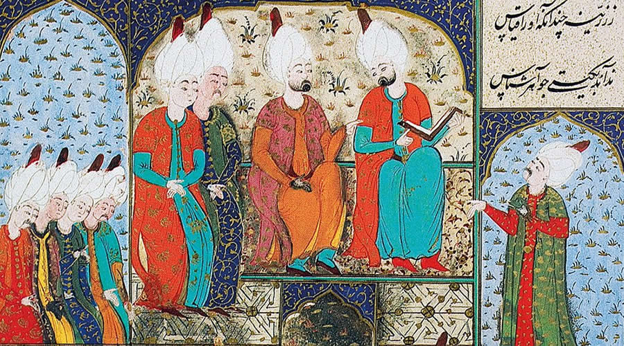 Safevî şehzadesi Elkas Mirza’dan gelen hediyelerin takdimi sırasında Rüstem Paşa’yı (ortada) gösteren minyatür.